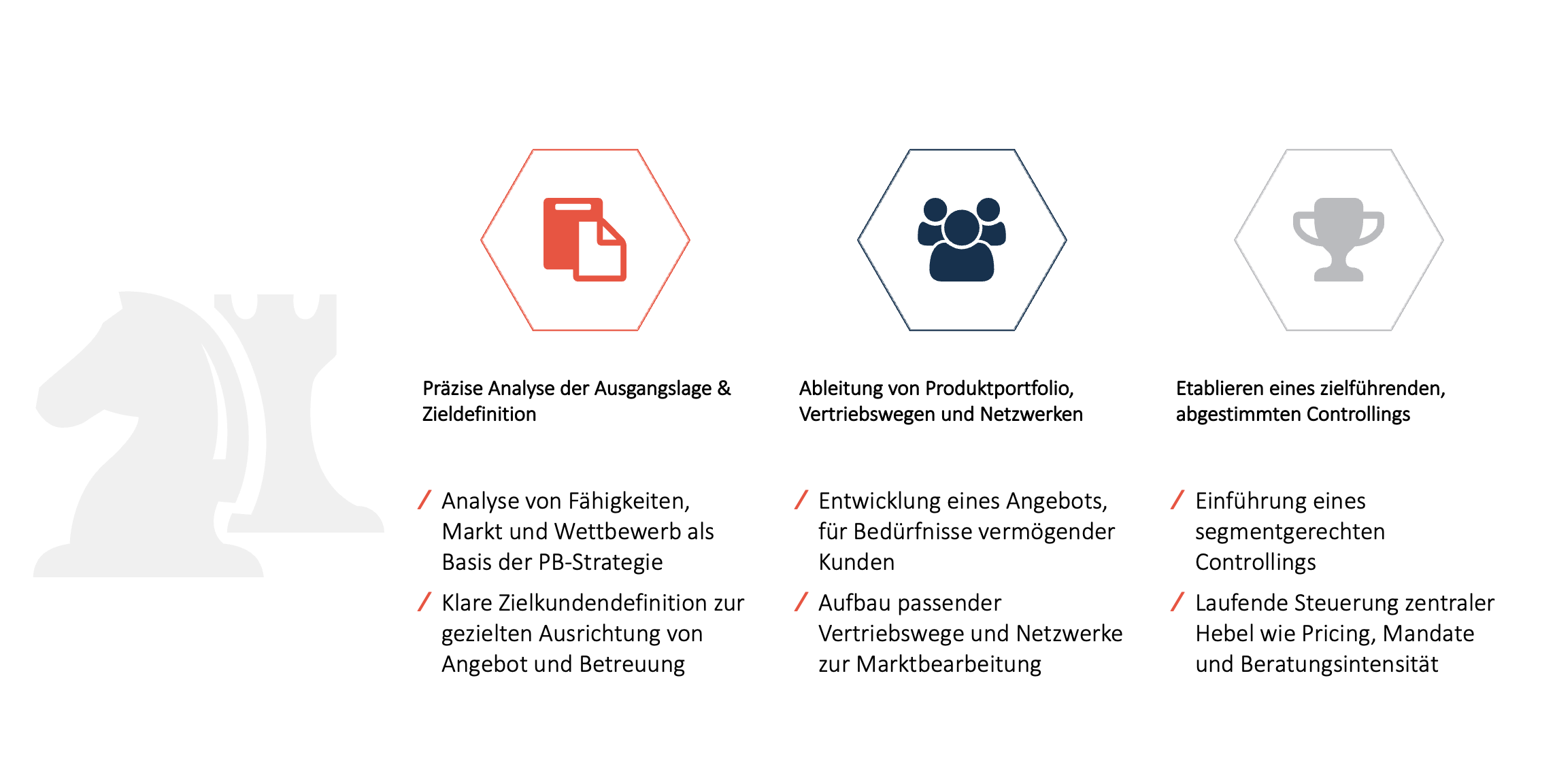 Aus unserer Projekterfahrung heraus sind insbesondere drei Bausteine für den systematischen Ausbau des Private Banking Segments ausschlaggebend: erstens eine präzise Analyse der Ausgangslage mit klarer Zieldefinition, zweitens die passgenaue Ableitung von Angebot, Vertrieb und Netzwerken, drittens ein auf das Segment zugeschnittenes Controlling.