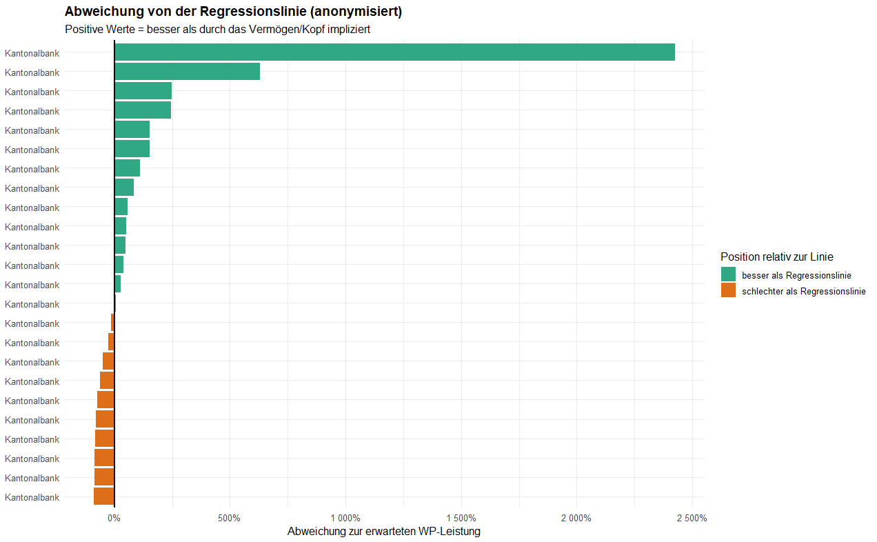 Die richtige Schlussfolgerung ist nicht, dass Marktstruktur irrelevant wäre. Im Gegenteil: Kantonalbanken starten mit unterschiedlichen Voraussetzungen. Aber die eigentliche Performancedifferenz entsteht erst durch die Fähigkeit, dieses Potenzial in profitable Kundenbeziehungen, Mandate und wiederkehrende Erträge zu übersetzen. Dies scheinen einzelne Kantonalbanken nun besonders gut (positive Abweichung) und andere weniger gut zu schaffen.