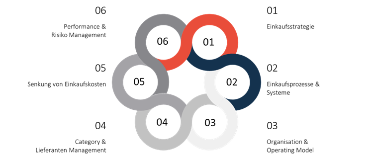 - Strukturell verankert: Mit unserem ganzheitlichen E2E-Ansatz optimieren wir Einkaufsprozesse, etablieren klare Rollen und Verantwortlichkeiten, entwickeln die nötigen „Skills“ und die entsprechende Aufbauorganisation, um Ihren Einkauf fit für die Zukunft zu machen.