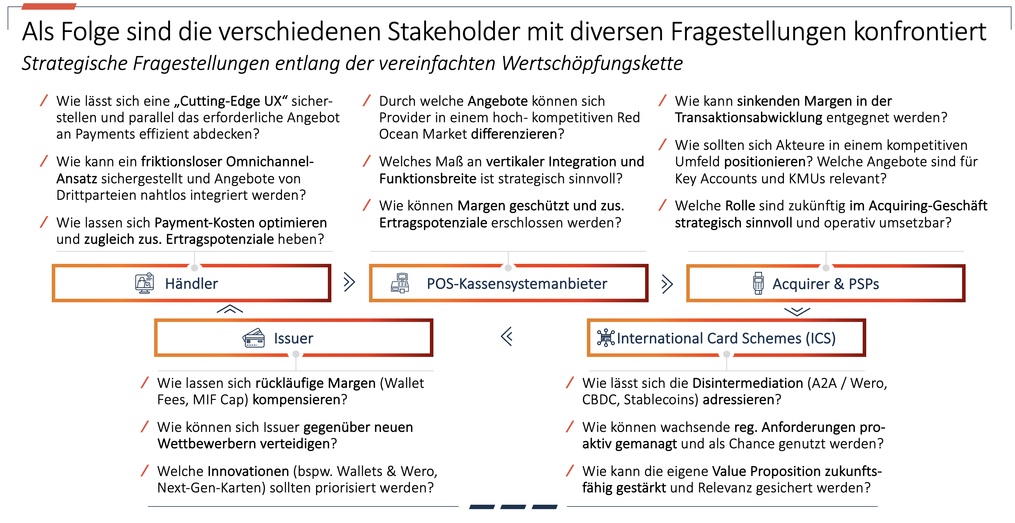 Payments/Zahlungen sind ein fester Bestandteil im Alltag von Privatpersonen und Unternehmen. 2024 wurden in der Eurozone ca. 150 Mrd. elektronische Zahlungstransaktionen mit einem Volumen von ca. 230 Bio. EUR durchgeführt (Quelle: EZB) – Tendenz seit Jahren steigend. Diese Zahlen verdeutlichen die Wichtigkeit von Payments und seine Rolle als „Schmiermittel“ der Wirtschaft. Gleichzeitig verändert sich die Art, wie gezahlt wird, fundamental: war vor nicht wenigen Jahren die Bargeldzahlung im B2C-Bereich noch unangefochten an der Spitze, führen Konsumenten Zahlungen heute vermehrt mit digitalen Wallets, Debit- und Kreditkarten sowie alternative Bezahlverfahren (z.B. PayPal, in absehbarer Zeit auch Wero) durch. Dieser Trend, der sich in den letzten Jahren nochmals beschleunigt hat sowie grundlegende Veränderungen im Geschäftsmodell (rückläufige Margen im reinen Payments Processing), in der Wettbewerberlandschaft (große Transaktionen, neue Wettbewerber), in der Technologie (alternative Payment Rails, Data Analytics/KI) und in der Regulatorik (PSD3, PSR, FIDA) machen Payments zu einem hochdynamischen Feld. Diese hohe Veränderungsgeschwindigkeit stellt die verschiedenen Marktteilnehmer im Zahlungskreislauf, namentlich Händler, POS-Kassensystemanbieter, Acquirer & PSPs, Schemes und Banken/Issuer vor gewichtige Herausforderungen, u.a. hinsichtlich Positionierung, Geschäftsmodell, und Value Proposition. Das Horn & Company Competence Center Payments steht Ihnen im Bereich der Zahlungsakzeptanz und des Issuing als erfahrener Berater von der strategischen Fragestellung bis zur Umsetzung zur Seite. Wie Sie auf der folgenden Abbildung beispielhafter Projektreferenzen sehen können, greift das Team greift dabei auf langjährige Erfahrungen entlang der gesamten Payments-Wertschöpfungskette zurück. Wir freuen uns über Ihre Kontaktaufnahme. Wir beraten Sie im effizienten Management und in der strategischen Weiterentwicklung Ihrer Payment-Infrastruktur – von der Kosten- und Gebührenoptimierung über die Auswahl passender Zahlungsdienstleister bis hin zur Gestaltung nahtloser, kundenzentrierter Bezahlprozesse. Wir beraten Sie in der strategischen Weiterentwicklung Ihres POS- und ECR-Geschäfts – von der Positionierung im wettbewerbsintensiven Markt über den Ausbau cloudbasierter Softwarelösungen und integrierter Services bis hin zur Expansion in angrenzende Bereiche wie Zahlungsakzeptanz und Payment Processing. Wir beraten Sie in der strategischen Weiterentwicklung Ihres Acquiring- und PSP-Geschäfts – von der klaren Positionierung und Definition der Value Proposition über Wachstums- und Go-to-Market-Strategien bis hin zu Transaktionen, Betriebsmodellgestaltung und technologischer Transformation im dynamischen Payment-Ökosystem. Wir beraten Sie in der strategischen Weiterentwicklung von Kartennetzwerken – von der Neudefinition der Rolle im Zahlungsökosystem über den Ausbau von Mehrwertdiensten und Partnerschaften bis hin zum Einsatz neuer Technologien für Innovation, Sicherheit und datengetriebene Wertschöpfung. Wir beraten Sie in der Weiterentwicklung Ihres Issuing-Geschäfts – von der strategischen Neuausrichtung über die Entwicklung digitaler Payment- und Banking-Angebote bis hin zur Modernisierung von Plattformen und Technologien für mehr Effizienz, Kundenzentrierung und Innovationskraft. Wir unterstützen Marktteilnehmer im Payments-Ökosystem ganzheitlich beginnend bei Fragen zum Geschäftsmodell- und der Value Proposition hin zu Betriebsmodelldesign und Transformation sowie zu strategischen Transaktionen – von der Konzeption bis zur Umsetzung.Unsere Kunden