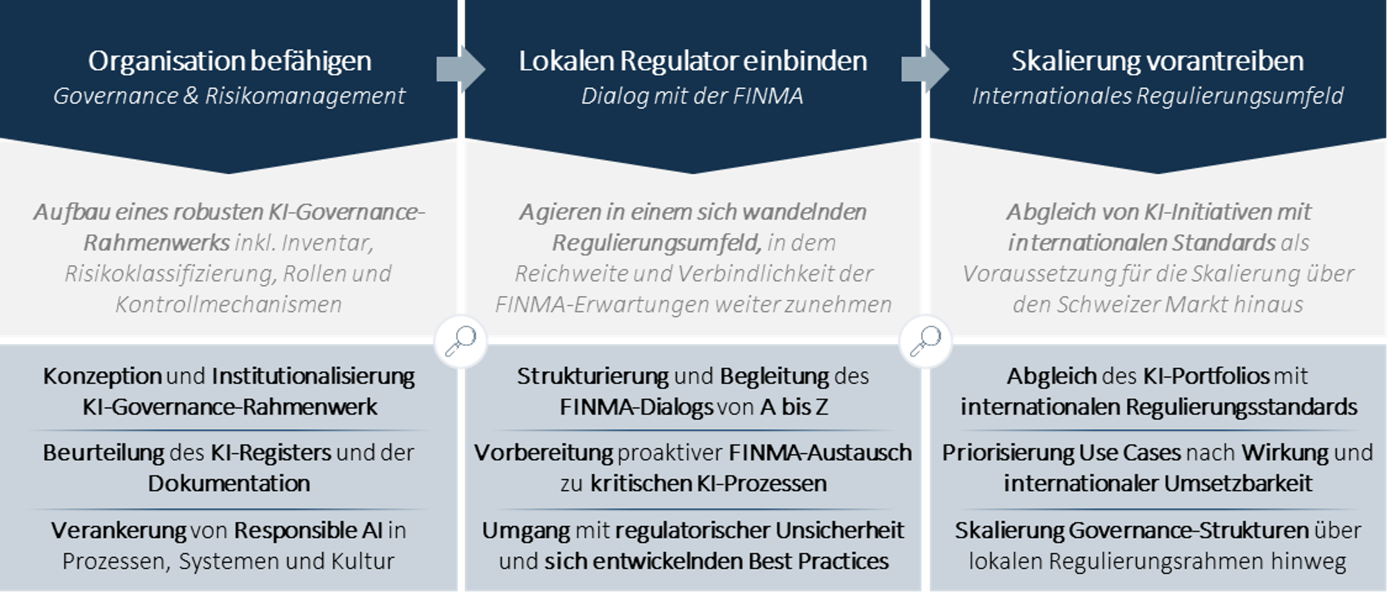 | Wir begleiten Versicherer und Finanzdienstleister bei der gezielten Einführung und produktiven Nutzung von KI, gestützt auf eine belastbare und FINMA-konforme Governance. Dabei bringen wir nicht nur ein erprobtes Playbook mit, sondern auch die Erfahrung aus der Umsetzung konkreter Use Cases, einschliesslich des Wissens, worauf es bei Risikokontrolle und hochwertigen Prozessen ankommt und wo typische Fallstricke liegen. Von der organisatorischen Verankerung und Risikosteuerung über die Erarbeitung konkreter Use Cases bis zum Reporting als Grundlage für den Aufsichtsdialog sind wir schnell einsatzbereit, arbeiten auf bestehender KI-Infrastruktur und verbinden praktische Implementierungserfahrung mit aktuellem KI-Risikoverständnis. |
