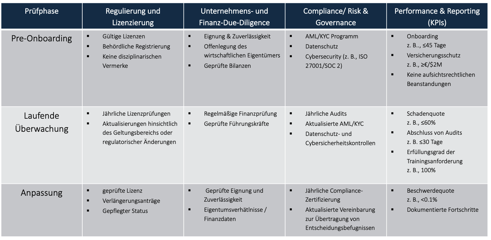 Ein strukturierter und mehrdimensionaler Screening-Prozess ist daher unerlässlich. Wir haben einen umfassenden Bewertungsrahmen entwickelt, der auf vier Säulen basiert: Regulierung und Lizenzierung, unternehmerische und finanzielle Due Diligence, Compliance/Risiko und Governance sowie Performance und Berichterstattung (siehe Tabelle 1). Eine disziplinierte Überwachung entlang dieser Säulen ermöglicht es Erstversicherern, sich ein ganzheitliches Bild von Risiken und Leistungen zu machen. Eine solche Strenge ist unverzichtbar, da DA von Natur aus Informationsasymmetrien, die Abhängigkeit von operativen Kontrollen und die Notwendigkeit einer systematischen Überwachung der Portfolioqualität im Zeitverlauf mit sich bringt.