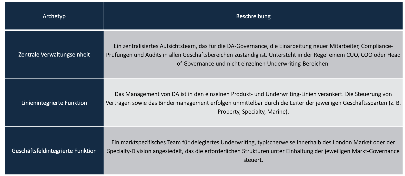Diese Governance-Archetypen veranschaulichen, wie Versicherer strategische Entscheidungsfindung und operative Leitlinien zu einem kohärenten Aufsichtssystem zusammenführen. Eine starke Governance umfasst in der Regel klare Grundsätze für die Kapazitätszuweisung, genau definierte Befugnisgrenzen, standardisierte Berichtsanforderungen, regelmäßige Leistungsüberprüfungen und unabhängige Auditfunktionen. Diese Elemente schaffen sowohl Transparenz als auch die Notwendigkeit enger Kontrolle – Bedingungen, die in einem outsourcingintensiven Modell wie DA unverzichtbar sind. Im Markt beobachten wir jedoch eine gewisse Tendenz, DA als separates Geschäftsmodell mit unabhängiger Governance zu gestalten.