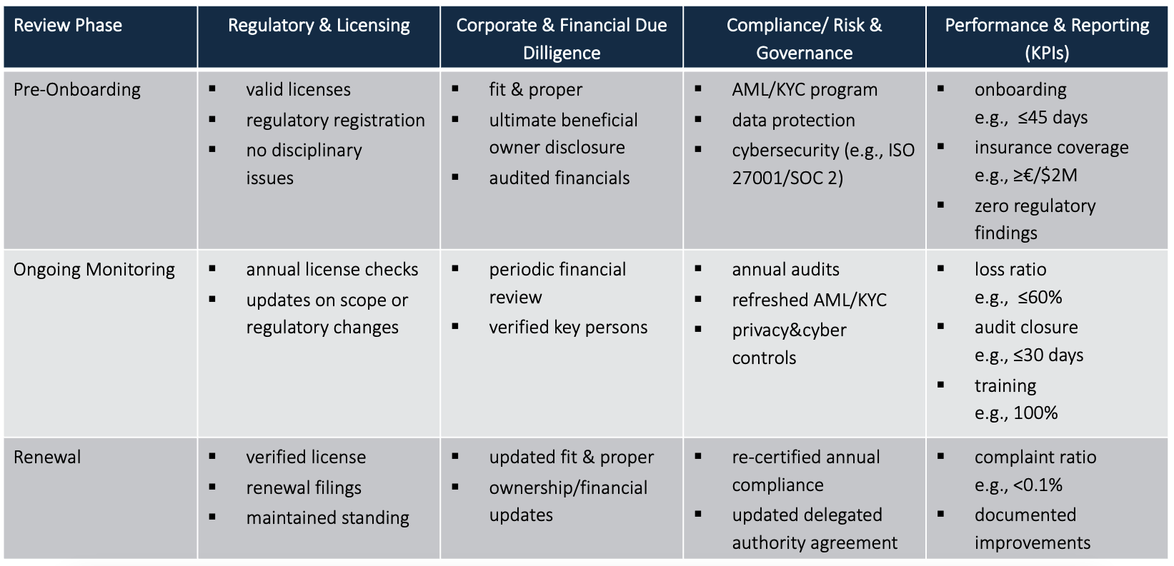 A structured and multidimensional screening process is therefore essential. We have distilled a comprehensive assessment framework leveraging four pillars: Regulatory & Licensing, Corporate & Financial Due Diligence, Compliance/Risk & Governance, and Performance & Reporting (see table 1). Disciplined monitoring along these pillars allows best-in-class primary insurers to form a holistic view on risk and performance. Such rigor is indispensable because delegated underwriting inherently introduces information asymmetry, reliance on remote operational controls, and the need for systematic monitoring of portfolio quality over time.