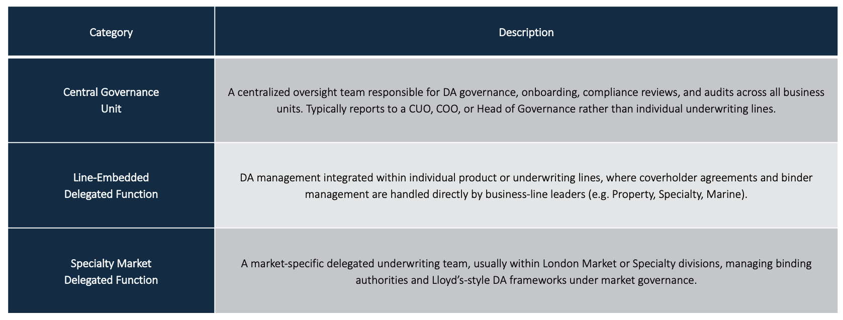 These governance archetypes illustrate how insurers align strategic decision-making and operational guidance into a coherent oversight system. Strong governance typically involves clear capacity allocation principles, well-defined authority limits, standardized reporting requirements, regular performance reviews and independent audit functions. These elements create both transparency and control - conditions that are indispensable in an outsourcing-intensive model such as delegated authority. However, in the market, we see a certain tendency to design DA as a separate business model with independent governance.